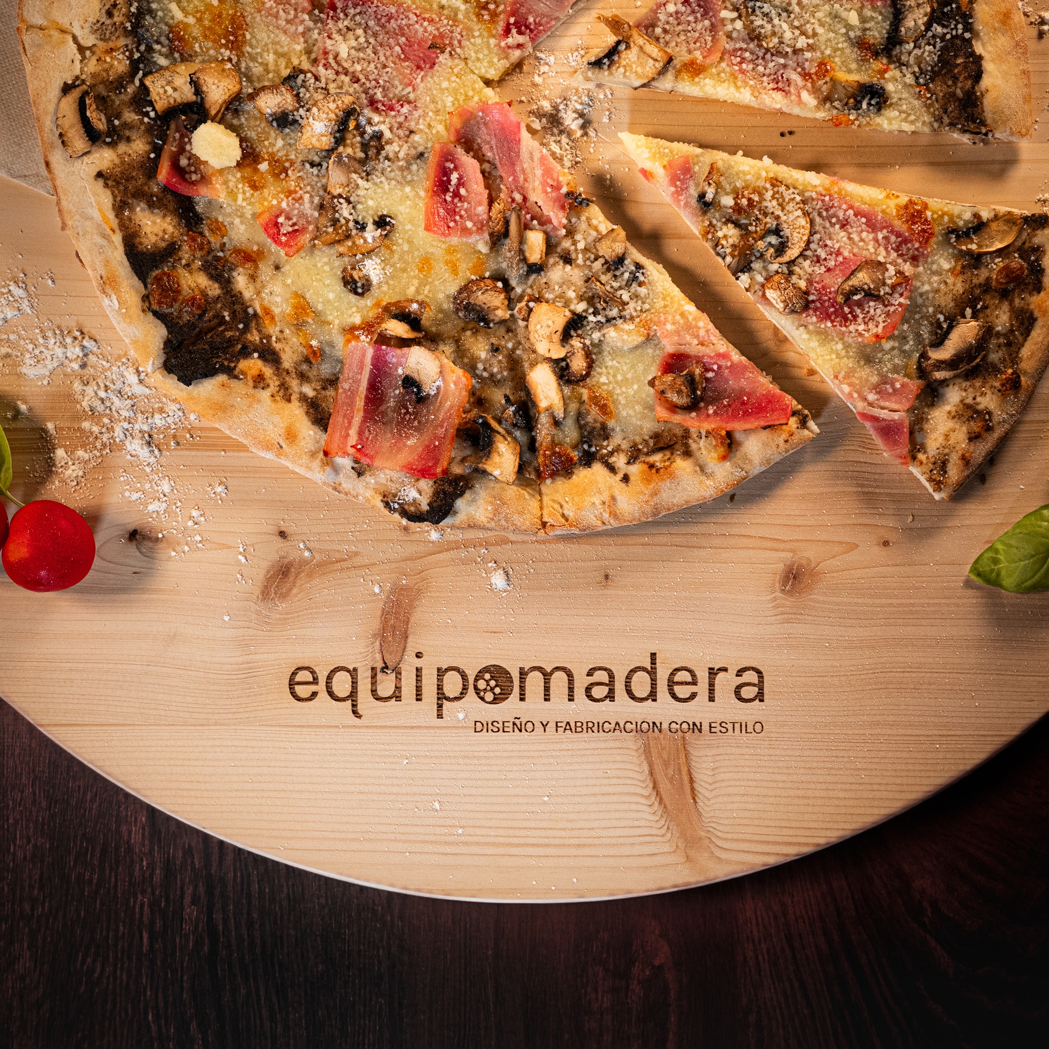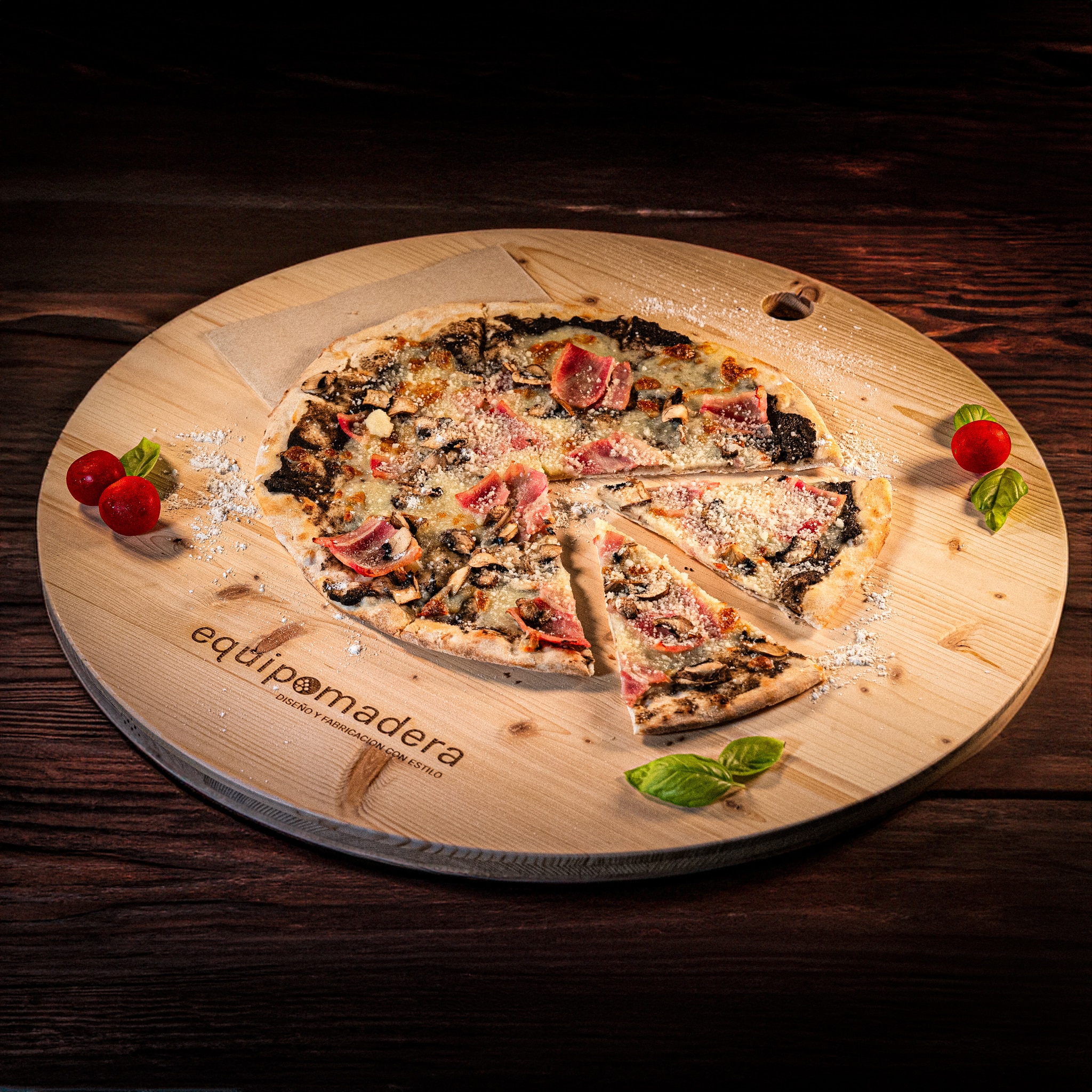 Bandeja de madera para pizza personalizada con el logo de tu empresa. La bandeja viene tratada con un barniz alimentario. Perfecta como regalo corporativo.