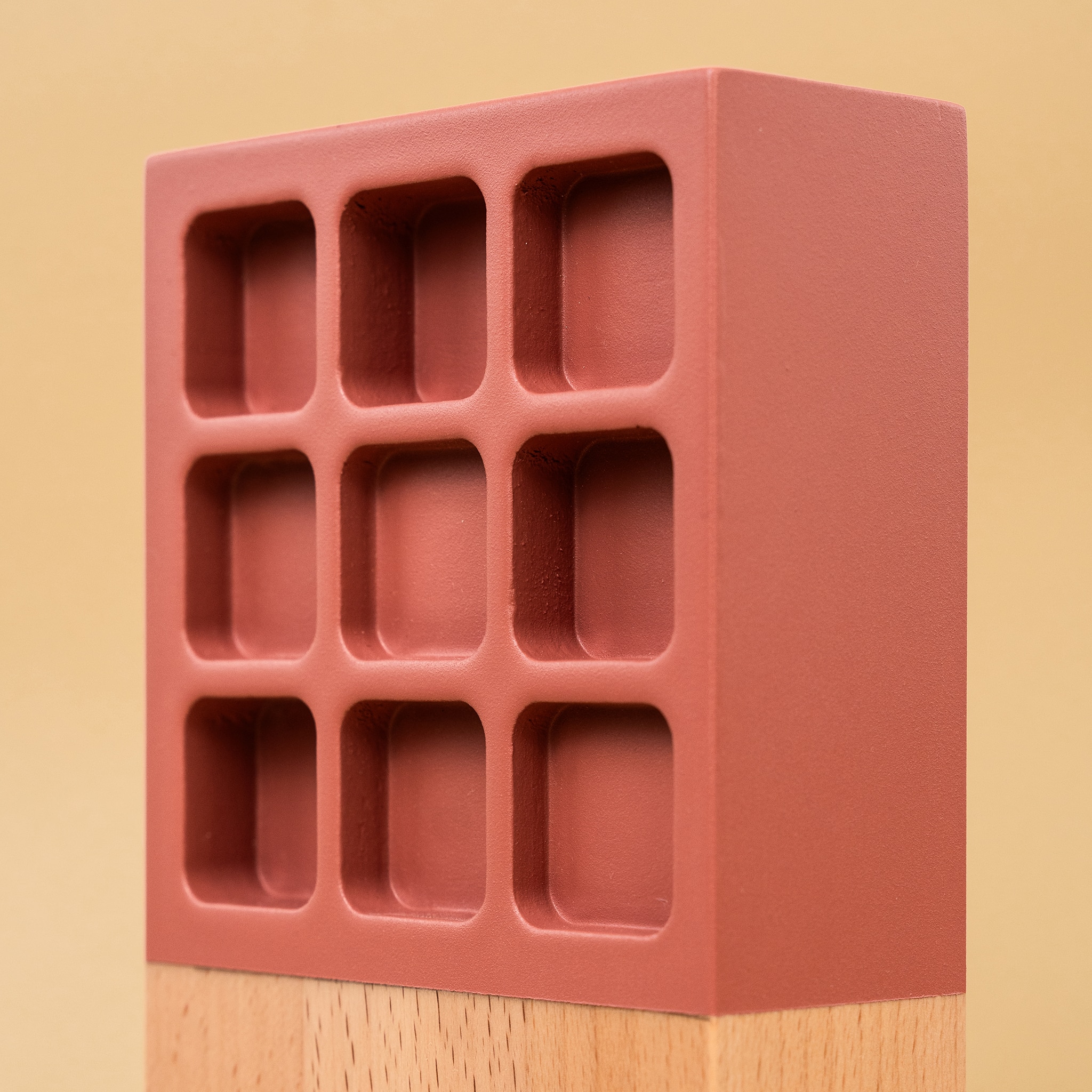 Este trofeo de madera se inspira en conceptos geométricos y su estructura evoca una retícula o malla, simbolizando la interconexión y la expansión de ideas. Cada vaciado del trofeo se ensambla en una red modular que refleja la adaptabilidad y el crecimiento continuo de las organizaciones modernas.