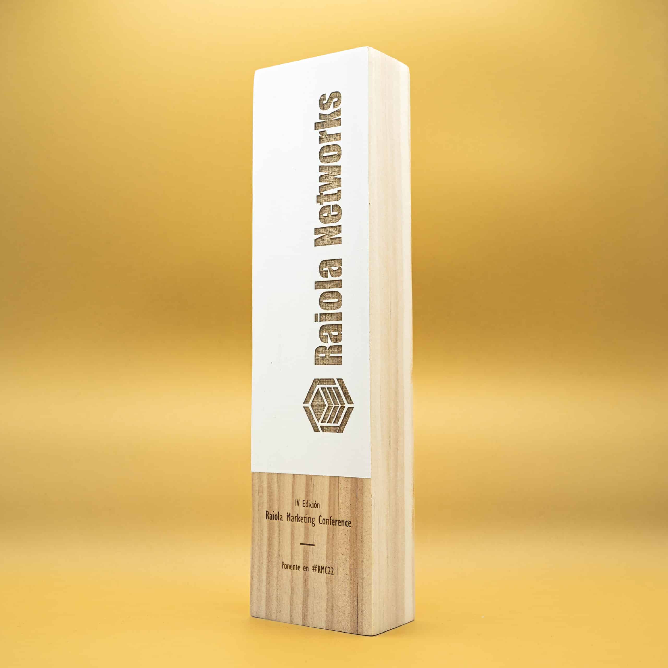 El trofeo Totem es una pieza con una fácil adaptación corporativa y con una entrega muy estética a la mano. Por su proporción y forma recuerda a una antorcha, un símbolo olímpico con unos valores afines al esfuerzo, la superación o el triunfo en equipo. Al igual que en el trofeo Wall, el trofeo Totem facilita mucho su personalización por su simplicidad formal. En la galería puedes ver diferentes ejemplos y cada uno con una idea y sensación muy distintas. Por ejemplo, en el trofeo para Coca-cola, el lacado antracita se presenta casi como una funda sobre la madera. En cambio, en los Premios VPC, el lacado dibuja creativamente la forma de una hoja y crea una imagen icónica que recuerda a un campo de césped cuando dispones los trofeos todos juntos, uno al lado de otro. Otro ejemplo sería el trofeo para Dove que, con una sola cara lacada, es pura simplicidad y pureza, casi, como si el trofeo estuviera bañado por una de las cremas blancas de la marca.